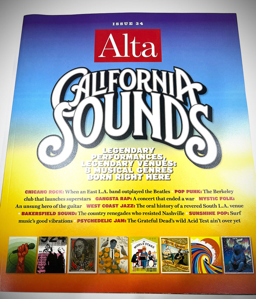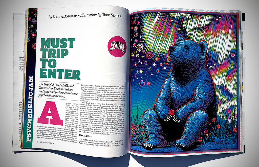 This art was created for the Alta Journal which is a quarterly publication centered out of the great state of California. The journal features essays, fiction, poetry, and photography from the region. I was told my illustration would accompany an article referencing the famous Muir Beach Acid Tests from 1965. My hope was to capture some of the tone and feel from these electrifying parties. The bear serves as both a symbol of California and The Grateful Dead. The color pallete is meant to resemble Aurora Borealis. I liked the idea that these tests from 1965 could be compared to a rare phenomenon from nature. My alternate title for this piece is: 'The Electric Kool-Aid Acid Test' in reference to Tom Wolfe's book.