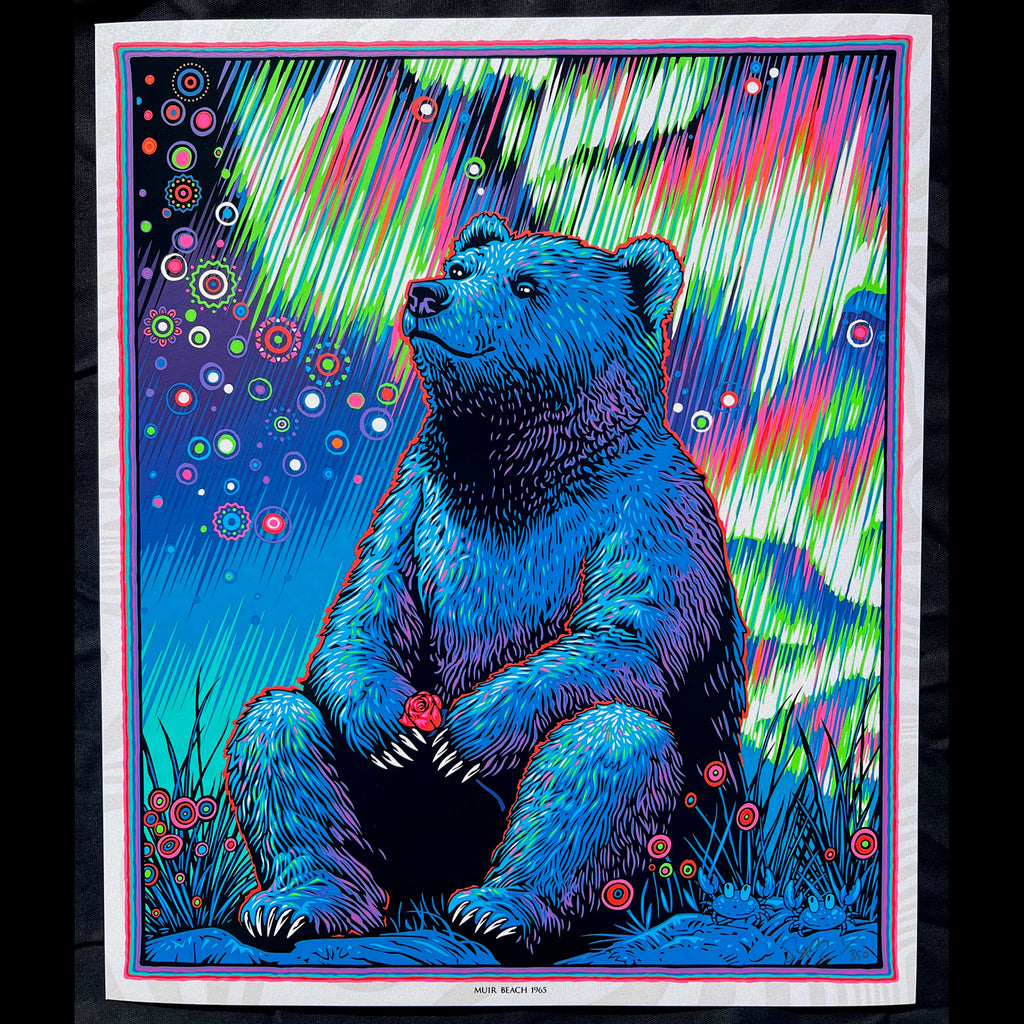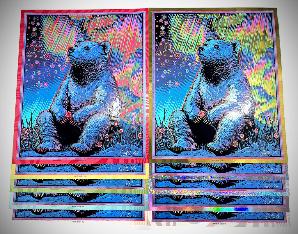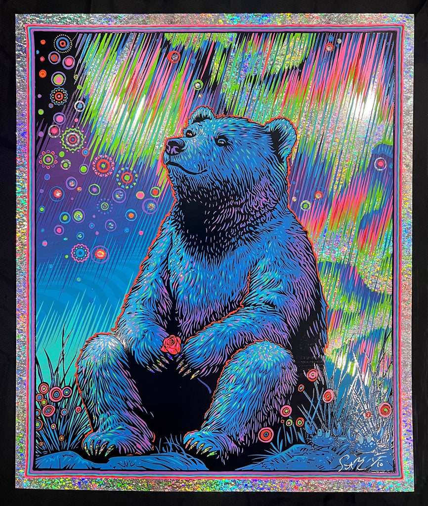 NOTES: 11.9 x 14.1 inches /// 17 screens (the most I've ever done!) /// edition of 350 plus a variety printed on jewel and rainbow foil toned stocks ranging from 8-12 copies /// all editions are signed and numbered by moi /// art is dedicated to Bob Weir