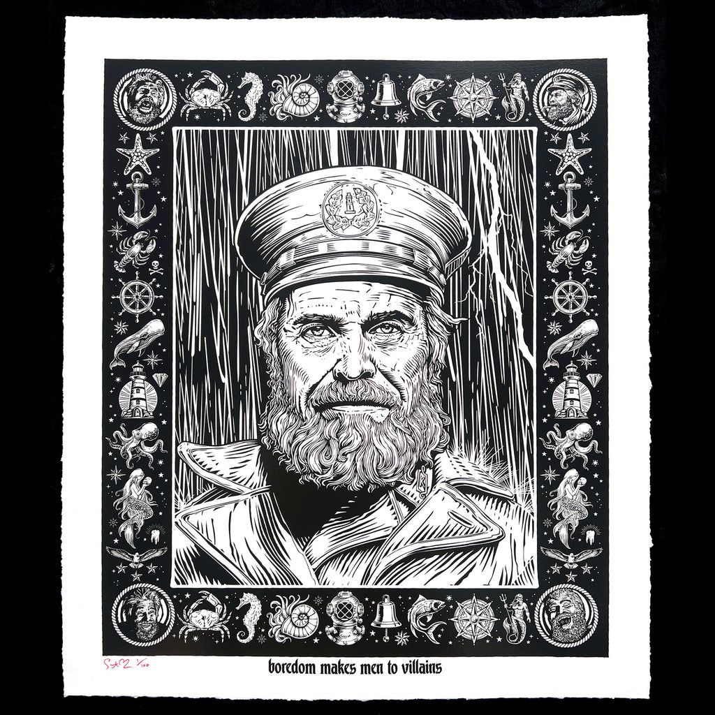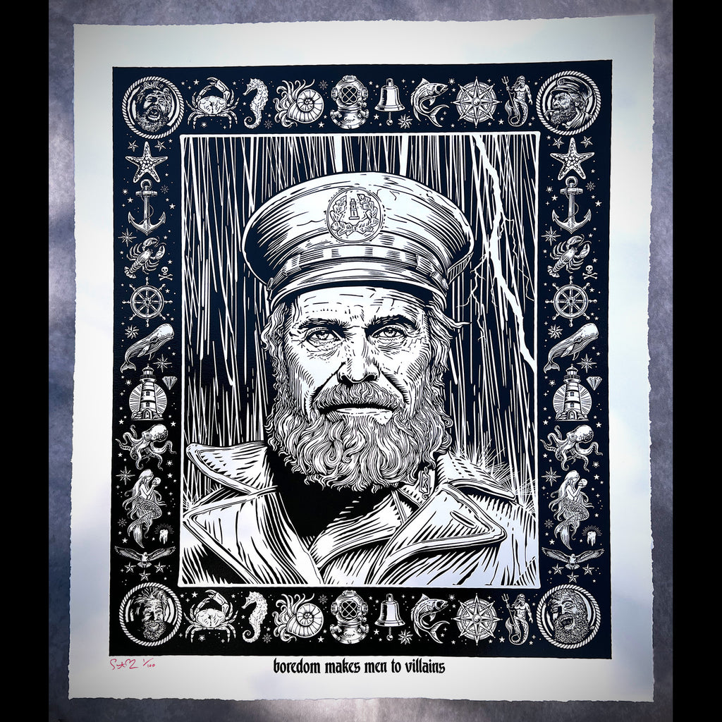 I'm embarrassed to say that I first watched The Lighthouse not in a grand theater or large screen tele but on a teeny iPad screen one night while I struggled to fall asleep. The experience watching it left me feeling as though I was slowly going insane. The claustrophobic nature of the film and the jittery and unnerving paranoia between Pattinson and Dafoe left my head swimming. I thought it was one I'd never watch again. But the next morning I found myself sketching Dafoe's face and thinking about nautical imagery. And then a week later I did rewatch the movie. And then twice more after that in the following month. Much of the art I end up loving most starts with an almost negative reaction to the work. This is also true for many of the bands I listen to. In the last year I've gone down an obsessive Xiu Xiu rabbit hole and have now consumed every note they have ever recorded in spite of not initially liking their music on my first listens. If any of this resonates with you then this art is for you. It was something I NEEDED to make.